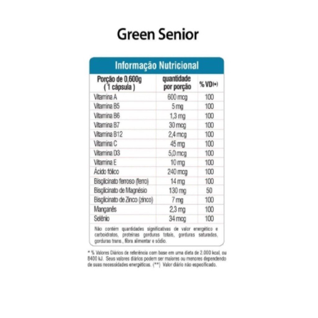 O Green Sênior é um suplemento que contém vitamina a, complexo b, vitamina c, vitamina d, vitamina e, Zinco entre outras. Produto dispensado de registro conforme rdc 240/2018. Ingredientes: amido, ácido ascórbico (Vit. c), ácido fólico (Vit. B9), ácido retinol (Vit. a), ácido pantatênico (Vit. B5), cianocobalamina (Vit. B12), bisglicinato de cálcio, bisglicinato ferroso, bisglicinato magnésio, bisglicinato de zinco, Vitamina D3, tocoferol (Vit. e), selênio e manganês, antiumectante dióxido de silício e cápsula de gelatina. Composição da cápsula: gelatina e água purificada. não contém glúten. Modo de usar: 1 cápsula ao dia. Contraindicações: hipersensibilidade (alergia) aos componentes da fórmula. Gestantes, nutrizes e crianças até 3 (três) anos somente consumir este produto sob orientação de nutricionista ou médico. O ministério da Saúde adverte: não existem evidências científicas comprovadas de que este alimento previna, trate ou cure doenças.